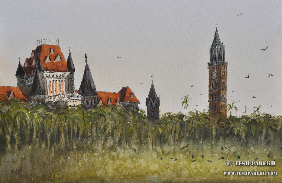This is a familiar view from the Churchgate area of Mumbai. The Oval Maidan (ground) is popular for cricket and other sports. When I stopped by during my recent Mumbai trip, it was empty except for those birds! I like the English architecture of Bombay High Court and Rajabai Tower in the background. Business district of South Mumbai has many beautiful buildings. More watercolor paintings of Mumbai to come. My recent paintings will be on the display for sale at the upcoming Holiday Home & Gift Show in New Bern, NC. I will be selling my work at the show Nov 10-13 (Fri-Sun).