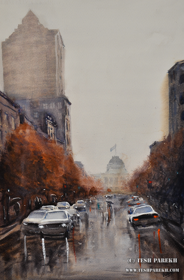 Raleigh Downtown on a Rainy Day – A watercolor painting by NC fine artist