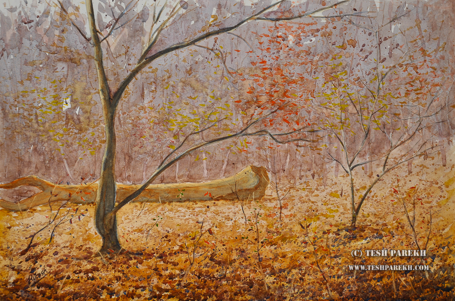 Fall. Trees. Fallen leaves. Fallen tree. One of those will be enough for me to make a painting! This painting has all! I started this watercolor on location at the Durant Nature Park. I used hot-pressed watercolor paper. I love the smoothness of this paper as I can draw details. And I love to draw! Painting on smooth surface is different from the usual rough surface that I use, especially when painting en plain air. And then there is the usual challenge of painting hundreds of leaves! But, watercolor is amazing that way. This was half sheet and the light was low. So, I finished this painting back in my studio.