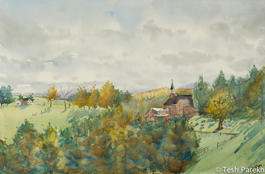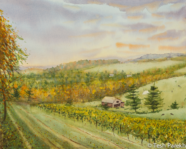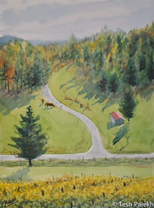 I finished three paintings while dealing with the elements. The first one was the morning view. I finished that before lunch. I started the “Mountain Road” before lunch and finished it after the lunch. A nice lady saw my painting unfold and decided to purchase it before it went for the auction. In the few minutes I had before the auction, I started and finished my third piece- the beautiful afternoon view.