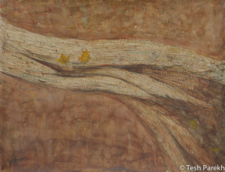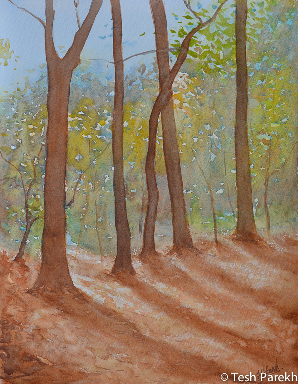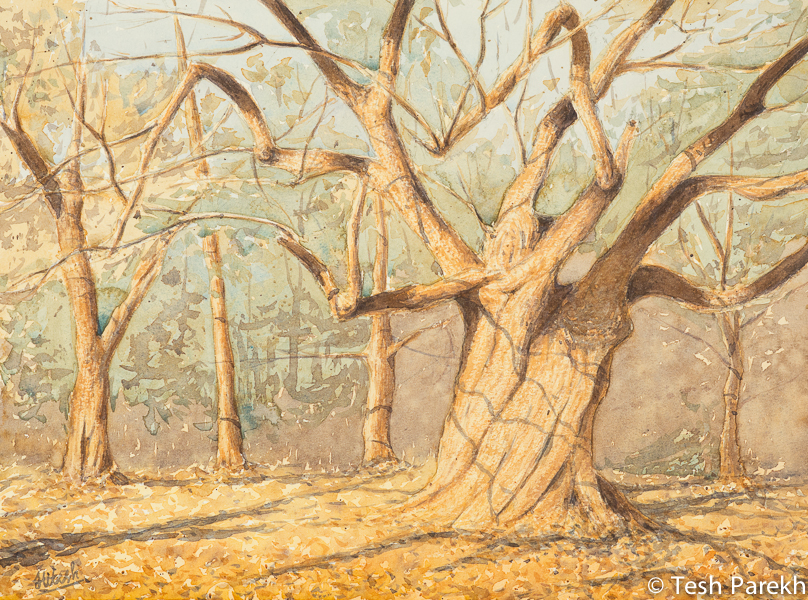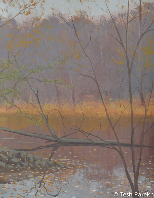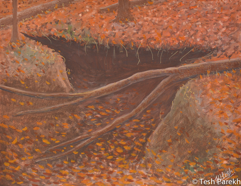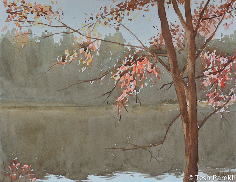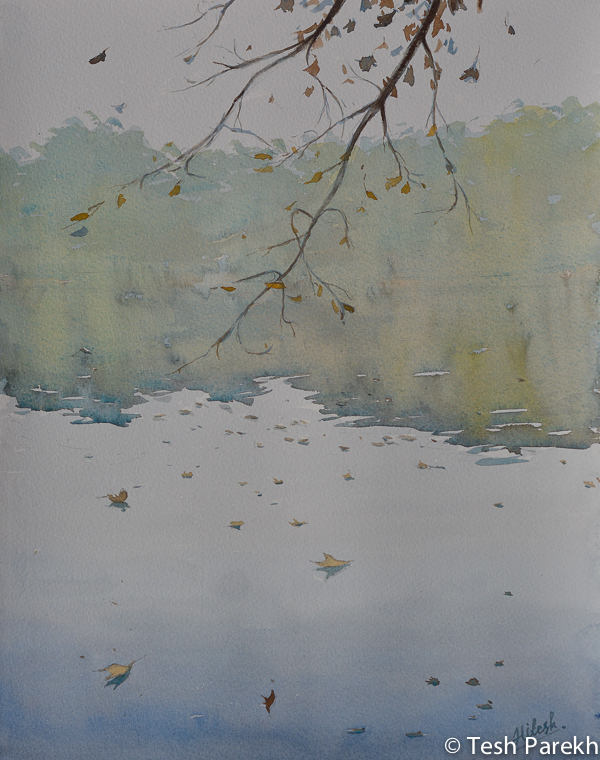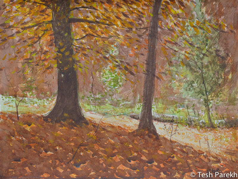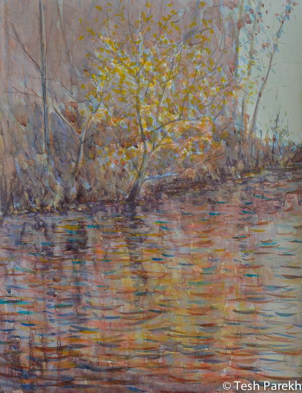 2014 was a good year for plein air painting. I had continued painting en plein air, well into November. Of course, late in the year, weather can be a challenge. So, I had to prepare well to paint outdoors. Paintings posted here were painted mostly at the Durant Nature Park in Raleigh. I had to walk on trails around the park, so, I had also simplified my painting gear. I was surprised at what I could do on location with minimal gear. After months of enjoying nice weather, painting in 40+ degree weather for couple of hours was quite a change! But, I enjoyed it. I also did a painting or two in gouache. Most paintings were completed entirely on location. Others were mostly done on location and then finished in the studio. I have done many fall paintings in the studio. But, the plein air experience is quite different. Nothing compares to the cool autumn air and painting under falling leaves. A painting or two were even done sitting on the ground. It was like painting sitting on a magic carpet of colorful leaves…
