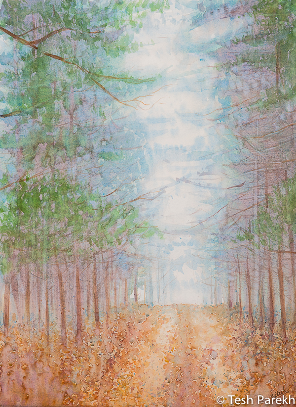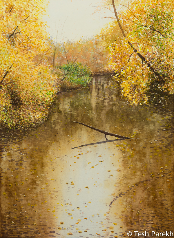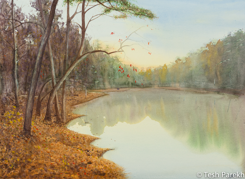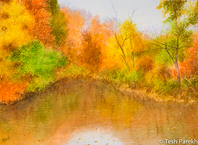 More paintings of beautiful North Carolina fall! I love the colors of North Carolina Fall. Last year, I did many plein air paintings during the fall. Plein air pieces are normally quarter to half sheet in size. I wanted to capture autumn’s glory on larger scale. So I painted below pieces in my studio. All the paintings were painted on full sheet of Arches Cold Press 140 lb paper. Due to the scale of the paintings and the amount of water I used, I had to stretch the paper. I have tried different ways of stretching the paper. The only stretching technique that has worked for me is Nita Engle’s technique. Nita has shared this technique in her book. This technique keeps the paper flat during the painting process. Arches Cold Press paper, once stretched, is a joy to use. It takes the washes and lifting well.