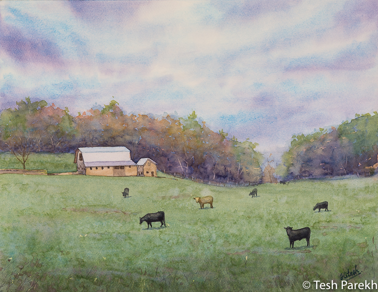 I was in Galax VA over a year ago for Chestnut Creek School of the Arts plein air paint out. The paint out was hosted by Mt. Vale Vineyards. I had completed 3 paintings and also sold one. This painting was done recently in my studio. I had seen this beautiful morning view while driving to the Vineyard. Early fall morning with cool air and cattle grazing in the fields. Clouds lit by rising Sun. Very picturesque. I used 300 lb paper for this painting. Saunders Waterford, I think. What I remember about the paint out is that it got very cold and it was very very windy. Studio piece was much easier to paint but plein air paintings were more fun.