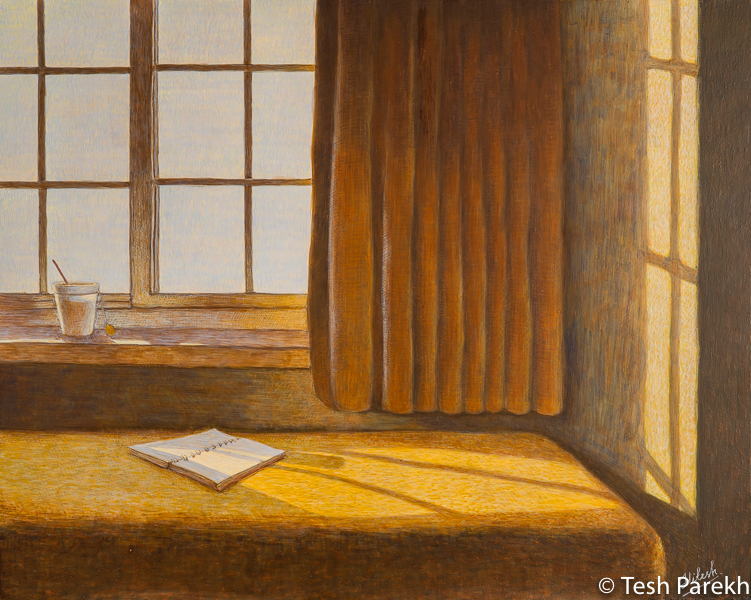 “Flow” was inspired by the light: both the quality and flow. I was traveling last year with Mica and Ian. We were in the Bryson city. Ian and I were making sketches of each other in that little sketchbook. And Ian had recently started to drink tea (more for the process of making tea than actually drinking it!). Later after Christmas, I started this painting. I spent more than a week working on it. It wasn’t an easy process but, I made it work in the end. At a different level, this painting symbolizes my own flow with my creativity.